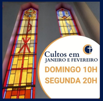 Lembramos a todos que os cultos durante os meses de janeiro e fevereiro acontecem aos domingos, às 10h, horário fixo, e nas segundas, às 20h. Durante esse bimestre não teremos cultos nos domingos às 19h. Os mesmos retornam a partir de março.