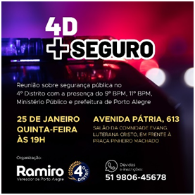 Este evento, sob a organização do nosso irmão, Vereador Ramiro Rosário, acontecerá no Lar da nossa Comunidade na próxima 5ª feira, dia 25 de janeiro às 19h, com a presença do 9º BPM, 11º BPM, Ministério Público e Prefeitura de Porto Alegre. O foco da reunião estará em Segurança Pública no 4º Distrito, onde nossa Comunidade está inserida. Participem!