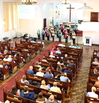 E, finalmente, no dia 09 de junho, após ampla higienização, voltamos a nos reunir em nosso templo, em momento de alegria e emoção. Nesse culto, os quatro pastores participaram paramentados e os coralistas usaram as cores da bandeira do Rio Grande do Sul, em homenagem e súplica por nosso estado, tão machucado por esta catástrofe.