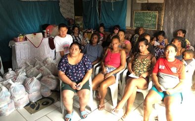 Um momento de cânticos e mensagem bíblica em torno da Páscoa antecedeu a entrega dos mantimentos.