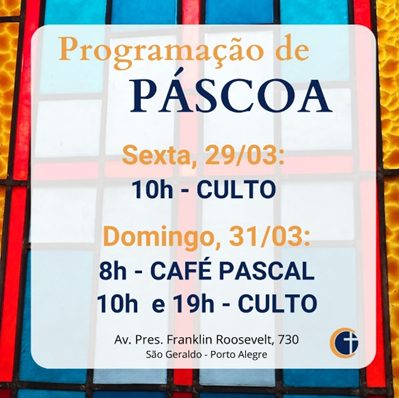 No dia 31 de março celebraremos a ressurreição de Jesus. Convidamos a todos a começarmos esse glorioso dia, com um “Café Pascal”, às 8h, no salão. Depois desse momento de comunhão, teremos nosso culto, às 10h. PARTICIPEM!