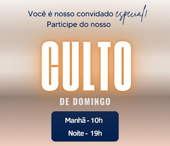 Todos estão convidados. Mas agora, solicitamos a que espalhem o convite. Convidem seus familiares, amigos e pessoas em geral, para desfrutarem da pregação da Palavra em nossos cultos. Todos os domingos, às 10h e às 19h.
