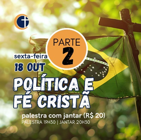A palestra: POLÍTICA E FÉ CRISTÃ (parte 2) será às 19h30. E, às 20h30 será servido um jantar (massa com molho branco).