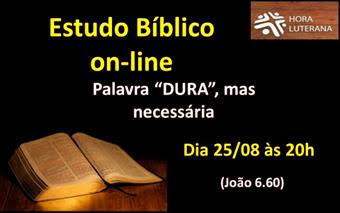 Além dos nossos estudos bíblicos on-line, que ocorrem nas quintas-feiras às 19h30, comunicamos que nas quartas-feiras temos o estudo da Hora Luterana. Na próxima quarta-feira, dia 25/08, será conduzido pelo pastor Ismar Pinz, com o tema PALAVRA DURA, MAS NECESSÁRIA. (João 6.60).